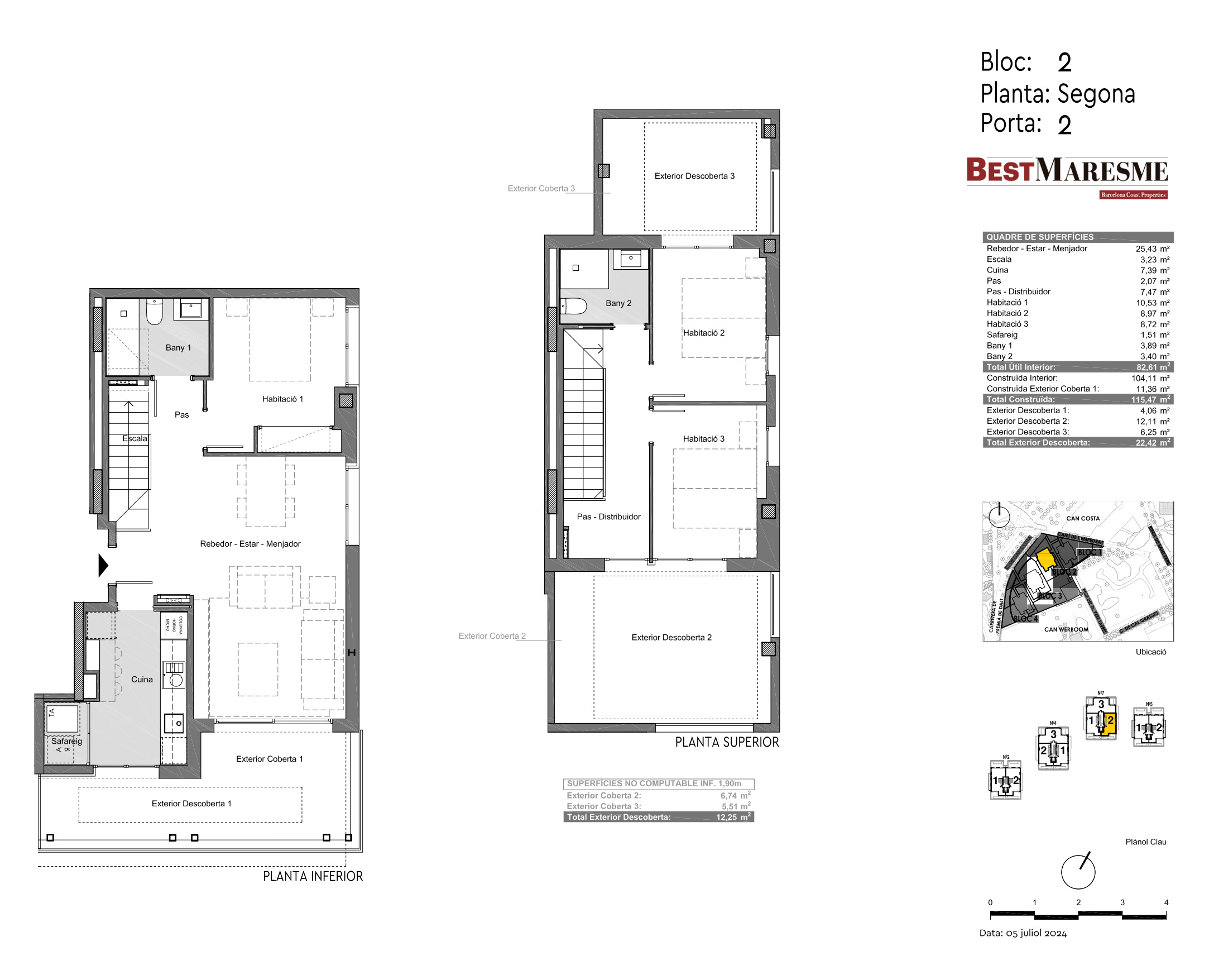 Els àtics ofereixen estances àmplies i lluminoses repartides en dues plantes. A la planta baixa hi ha les estances per compartir més temps en família, un saló-menjador i una àmplia cuina, tots dos connectades a l'exterior. En aquesta planta també hi ha un acollidor dormitori i un bany. La planta superior està dedicada a les estances individuals amb dos dormitoris, un bany i dues terrasses exteriors. Lespai perfecte per desconnectar al final del dia.