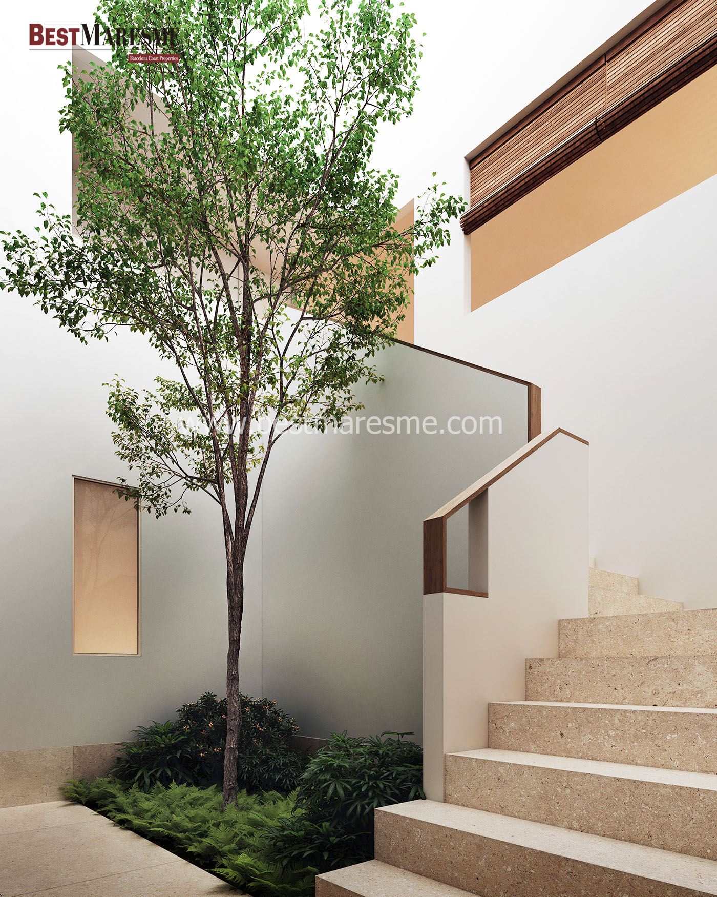L'habitatge compta amb un jardí que envolta la casa i està distribuït en dues plantes. En accedir per la planta baixa, a nivell de carrer, ens trobem amb el garatge per a dos cotxes i un ampli espai per a guardat, una habitació en suite amb bany privat i un pati interior on hi ha l'escala cap a la planta superior. Aquesta estada, reminiscència típica de les cases mediterrànies, està presidida per un arbre alimentat per la llum natural de la claraboia situada al sostre.