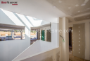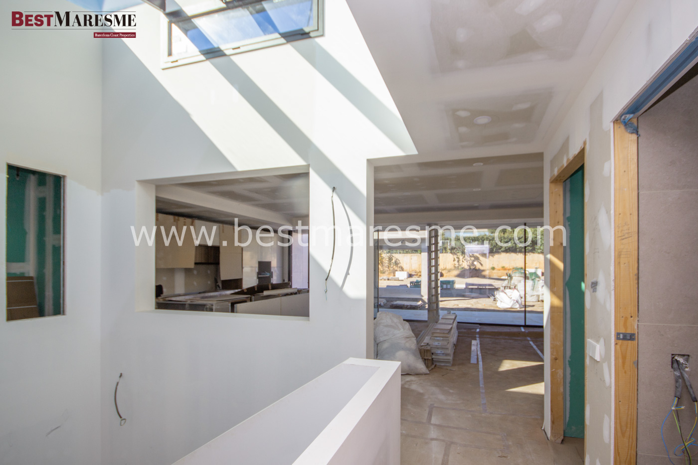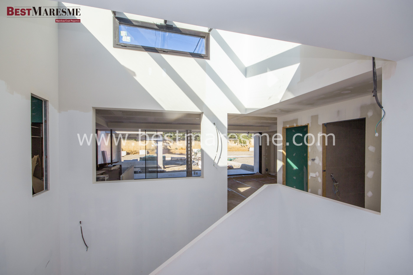 Un cop arribem a la primera planta ens trobem a cada costat del pati amb la zona de dia i la zona de nit, tot això a la mateixa planta. Si anem cap a la zona de dia ens trobem amb una àmplia estada on hi ha el saló, el menjador i la cuina, tot en un mateix còmode espai. Aquest espai està generosament il·luminat mitjançant la llum indirecta de la claraboia del pati i els amplis finestrals que donen accés directe al jardí. La zona de nit, a l'altra banda del pati cobert, es compon de tres habitacions una en suite amb bany privat i vestidor. L'espai previ a l'accés de les habitacions funciona com a estudi, il·luminat generosament pel pati.