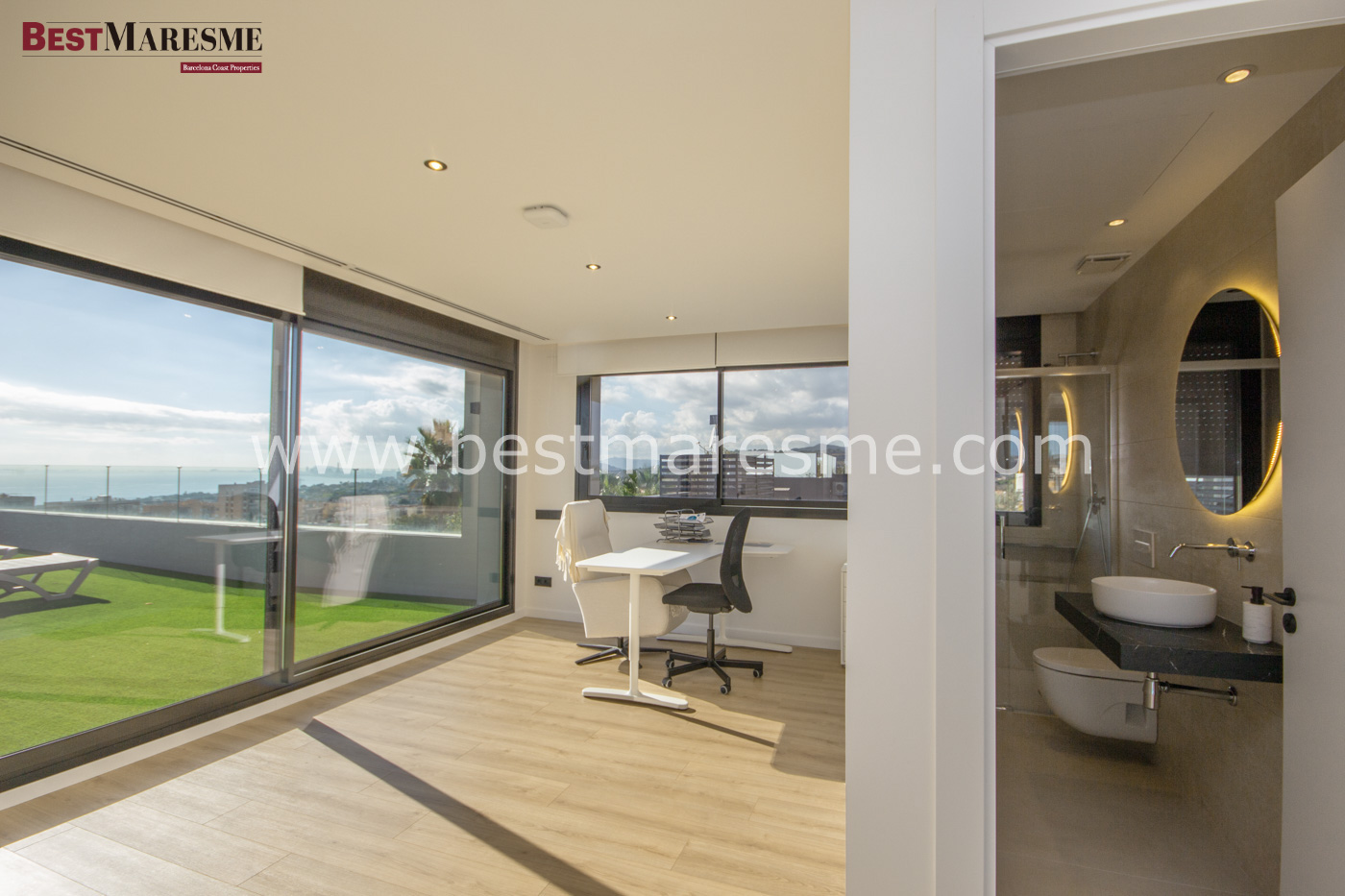 On the upper level of the house, there is an open-plan space ideal as an office, with a full bathroom, which can easily be transformed into an additional bedroom. From this level, you can access a large terrace with panoramic views of the sea, the mountains, and the city of Barcelona, a unique place to watch the sunset or enjoy moments of absolute tranquillity.